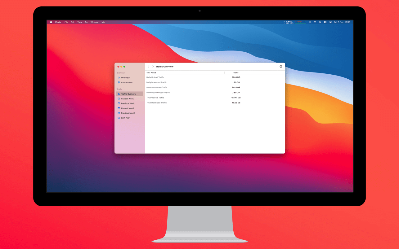 打开专属监控窗,立刻解锁更深层的连接洞察:活跃网卡自动识别、双向流量秒级刷新、体积限制计划专用的「流量概览」视图——尤其适合移动热点用户、家庭宽带限流场景,或远程办公中严控数据用量的专业人士。