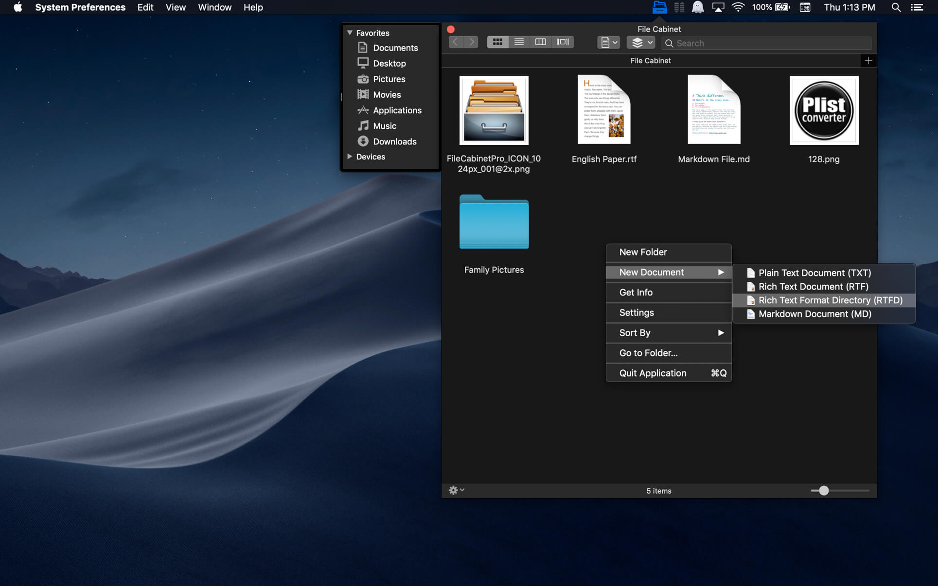 File Cabinet Pro is the file manager for the macOS menu bar. Quickly navigate to files without cluttering your desktop. Open, move, rename, compress, tag, trash, copy and paste files, all from the menu bar. You can open many file types natively in File Cabinet Pro or open files by launching other applications. It's easy to click into directories in icon view, drill through directories in list view, or navigate the file tree in column view.