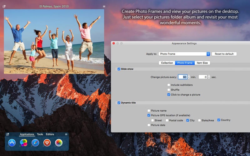 所有视觉体验由你掌控:通过「视图设置」自由调节幻灯节奏、窗口边框质感、元数据浮层(如拍摄时间/尺寸),甚至启用全新加入的 Shadow 与 Glow 动效——当前活跃应用的图集会微微发光,桌面状态一目了然。