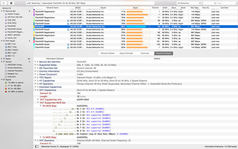 你能实时捕获每台接入点的完整DNA:不仅显示SSID和BSSID,更自动识别设备厂商、解析802.11协议版本(a/b/g/n/ac)、标注安全机制(WPA3/WPA2/WEP)、标定实际支持速率(最高达1.3Gbps),甚至逐项解码广播中的信息元素(IE)——比如全新支持的Telecom Infra Project AP Name与Wi-Fi Alliance Capabilities扩展字段,让企业级网络审计真正落地。